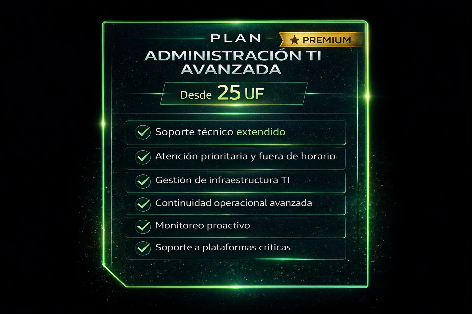 Diseñado para empresas con operación crítica que requieren soporte prioritario, gestión de infraestructura y continuidad operacional avanzada.