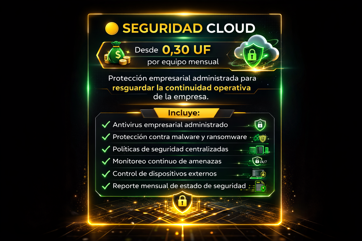 Protección empresarial administrada para resguardar la información y los sistemas frente a amenazas informáticas. Incluye monitoreo continuo, políticas de seguridad y control de riesgos para mantener la operación protegida.