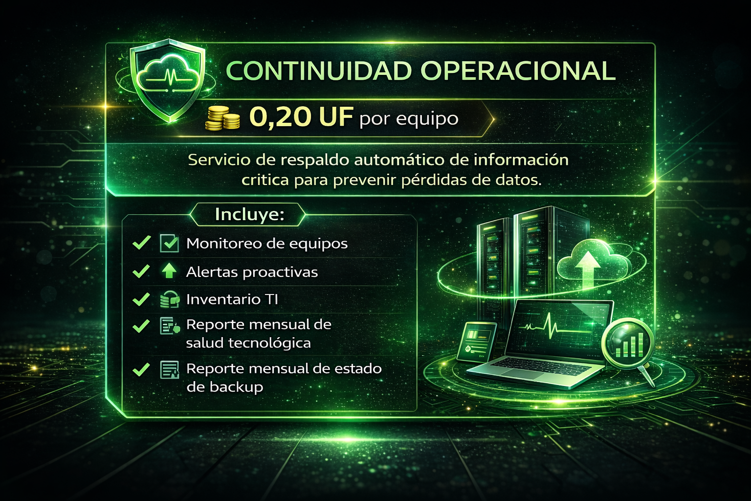 Servicio de monitoreo y gestión preventiva de equipos para asegurar el correcto funcionamiento de la operación tecnológica de la empresa. Permite detectar fallas antes de que afecten la productividad y mantener control total del estado de los sistemas.