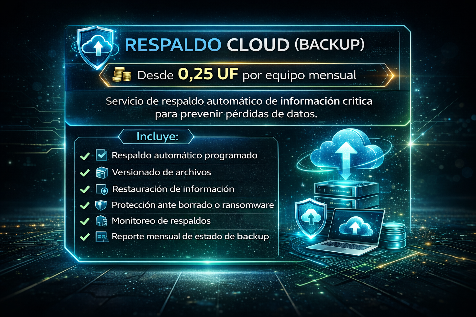 Sistema de respaldo automático de información crítica que garantiza la recuperación de datos ante fallas, errores humanos o ataques. Asegura la continuidad del negocio mediante copias seguras y restauración controlada.